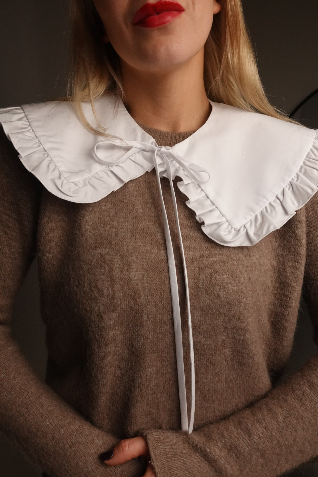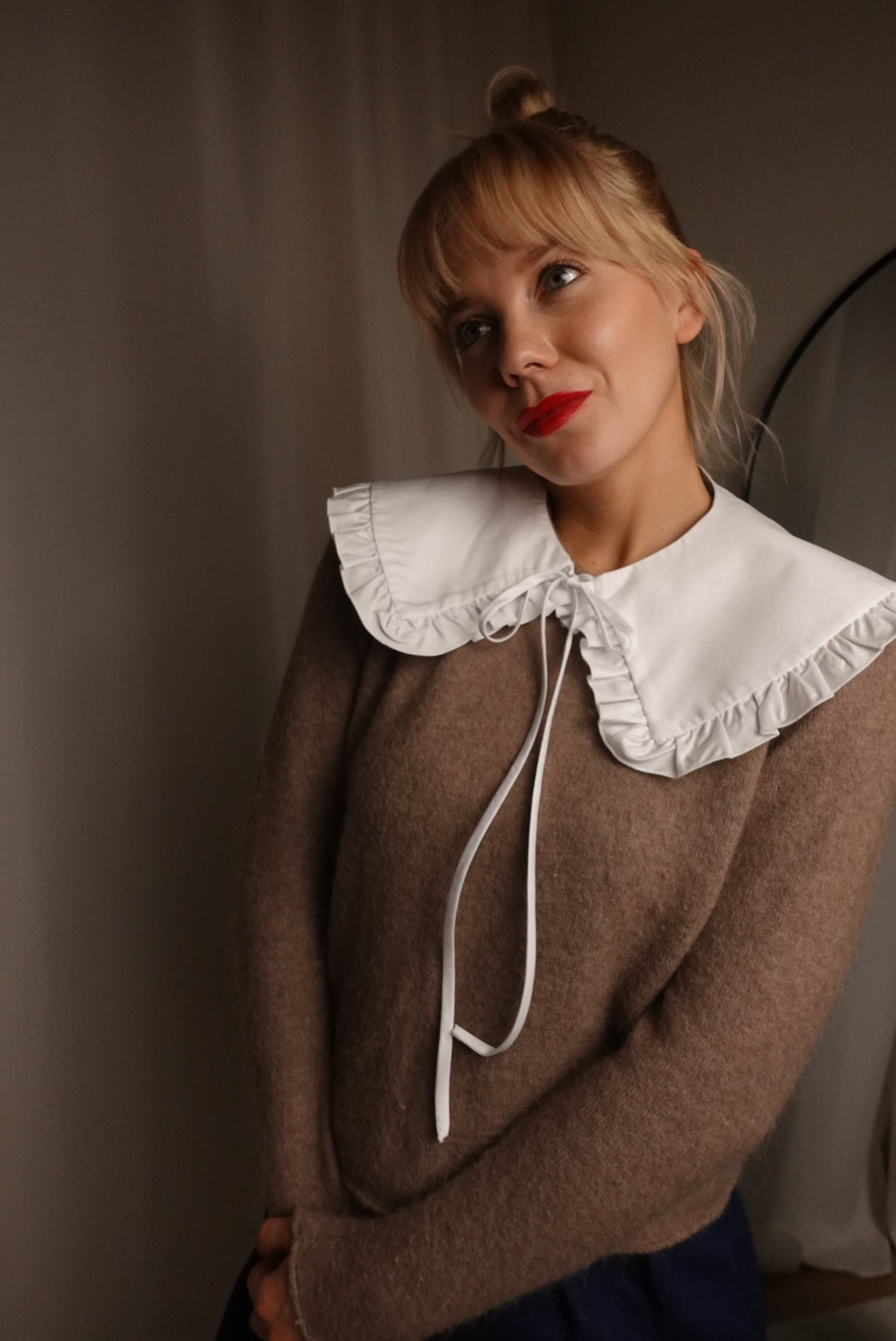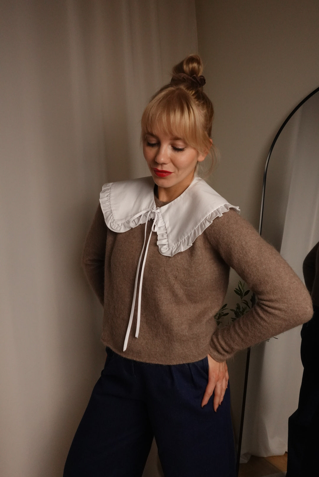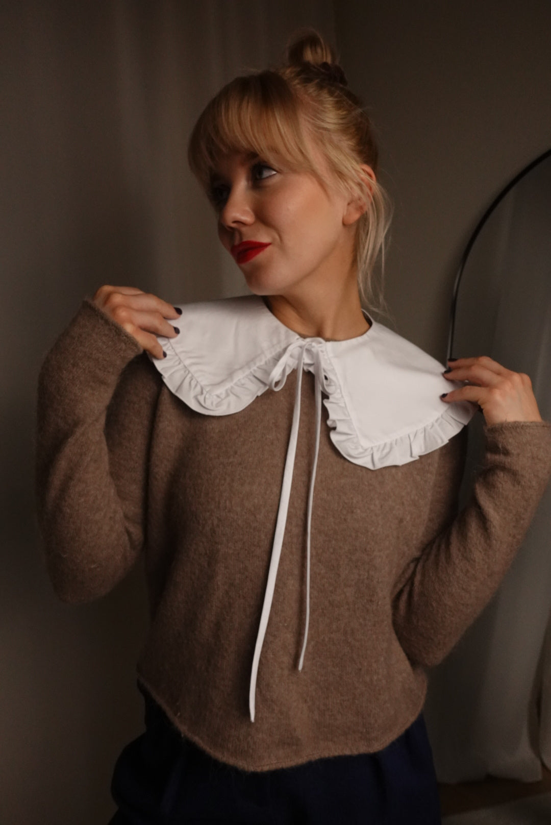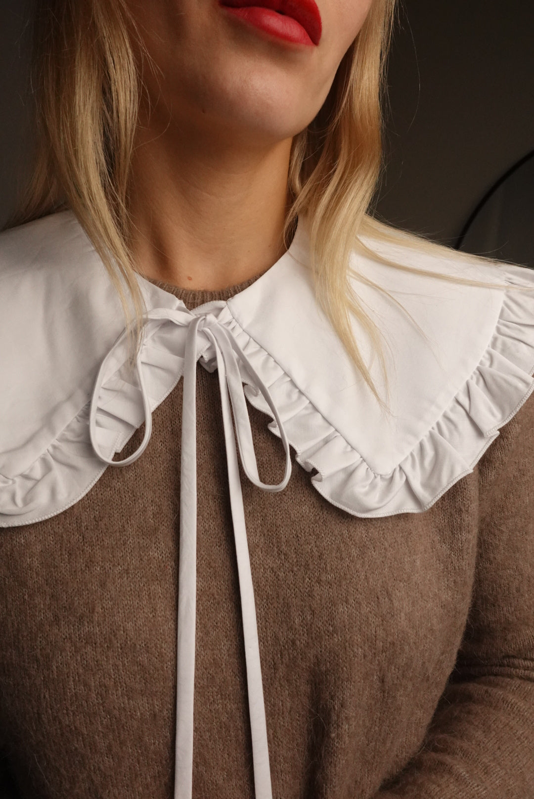 Biały, wiązany kołnierz to prosty sposób na wyjątkowy efekt. Wystarczy 30 sekund, by z najzwyklejszego swetra czy bluzki stworzyć stylizację z charakterem. To ciekawy, elegancki akcent, który odmieni każdy codzienny look.